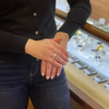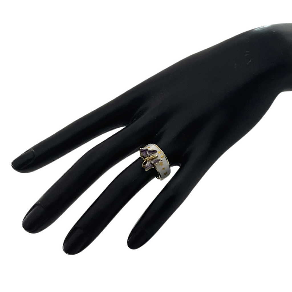 Vintage 14k yellow gold band beautifully decorated with white enamel and gold floral accents with a intricately painted gold and purple enamel butterfly has landed on the edge of the band. When a butterfly lands on you it can symbolize that you can be trusted with delicate things - a delightful sentiment.