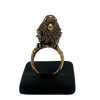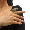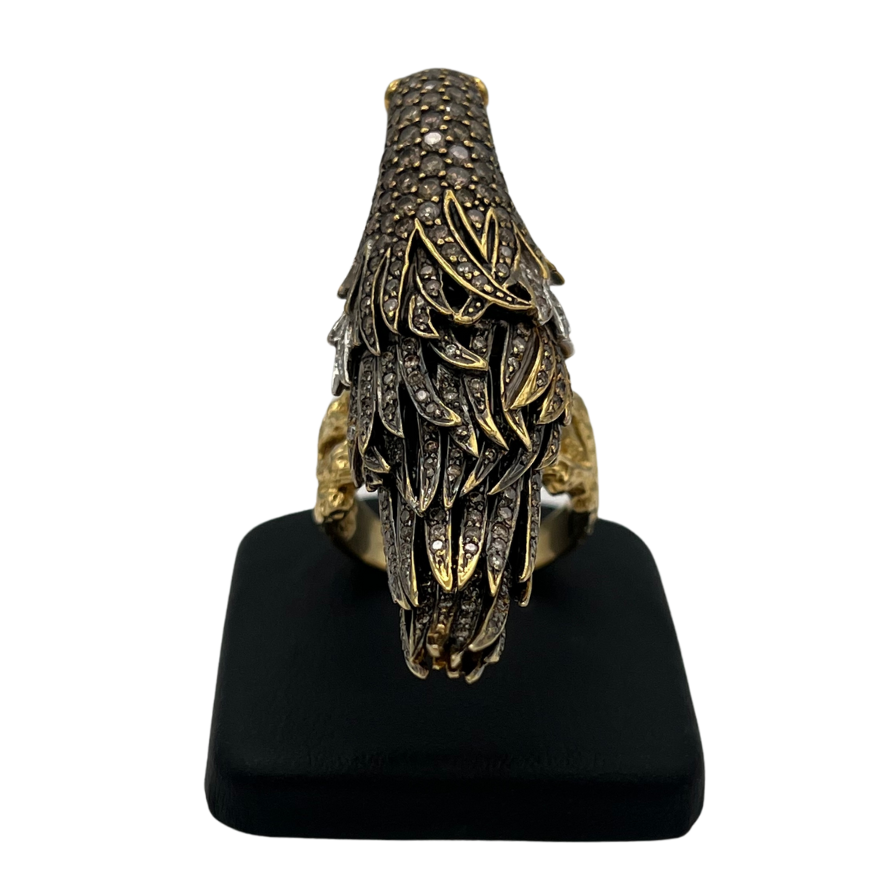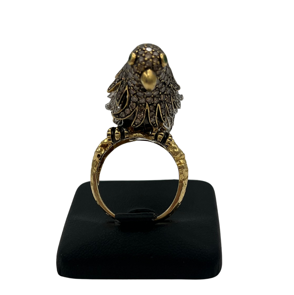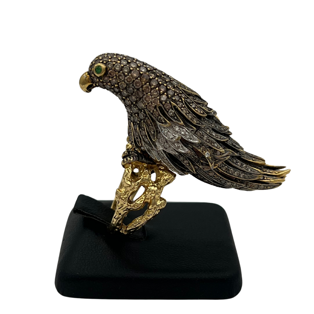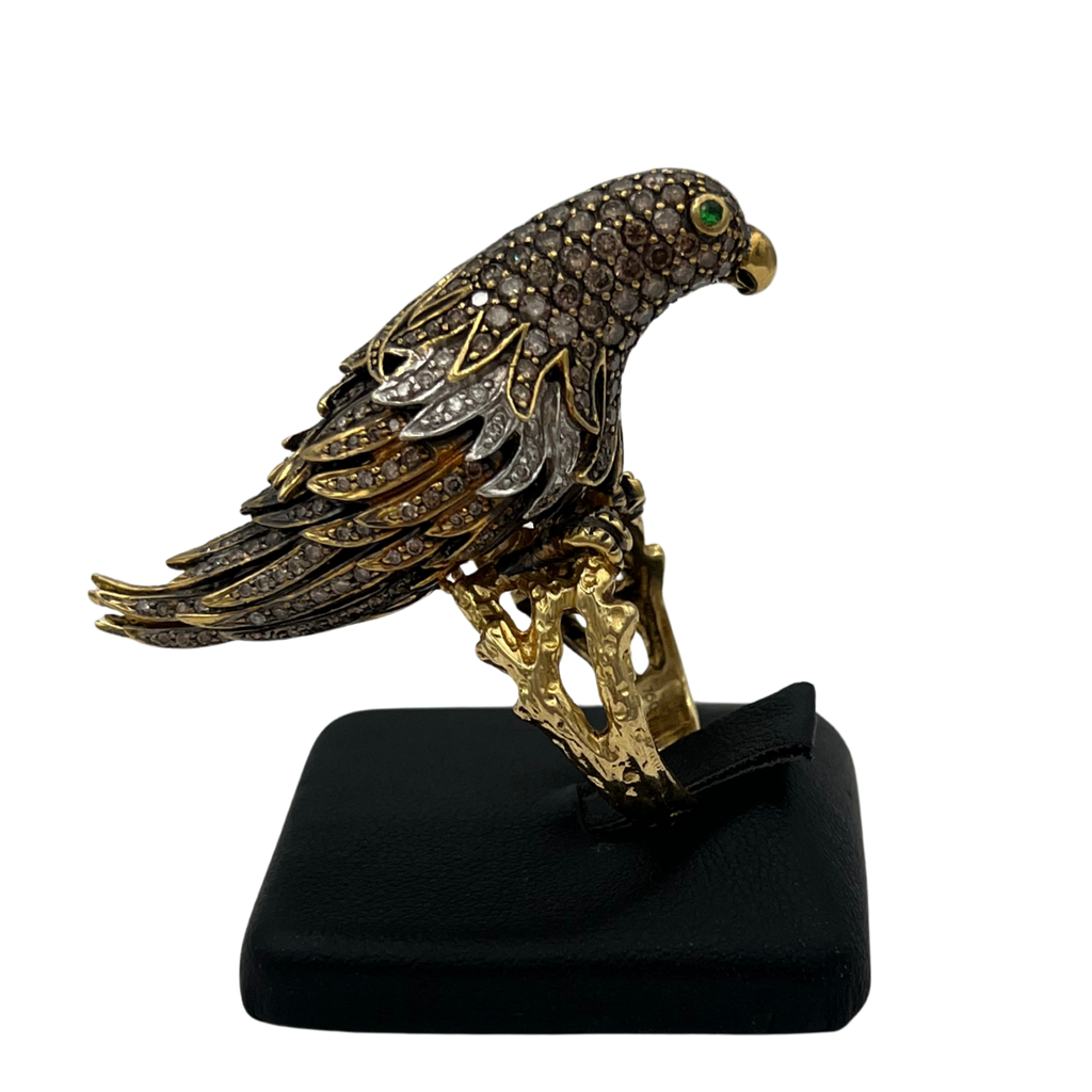 Truly a statement ring, this incredibly detailed parrot is pavé set with diamonds, and is perched on a textured abstract split shank 18k yellow gold band.