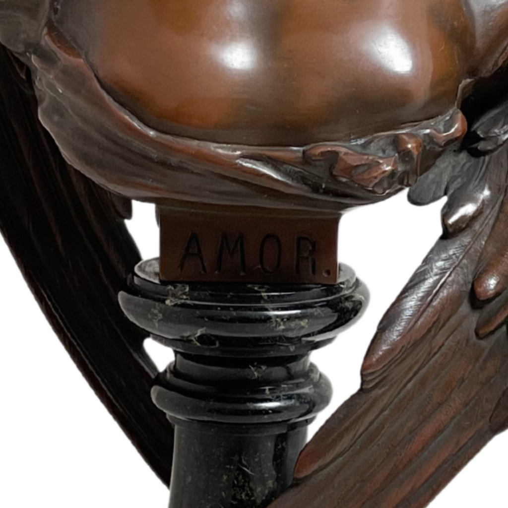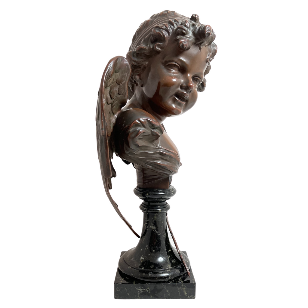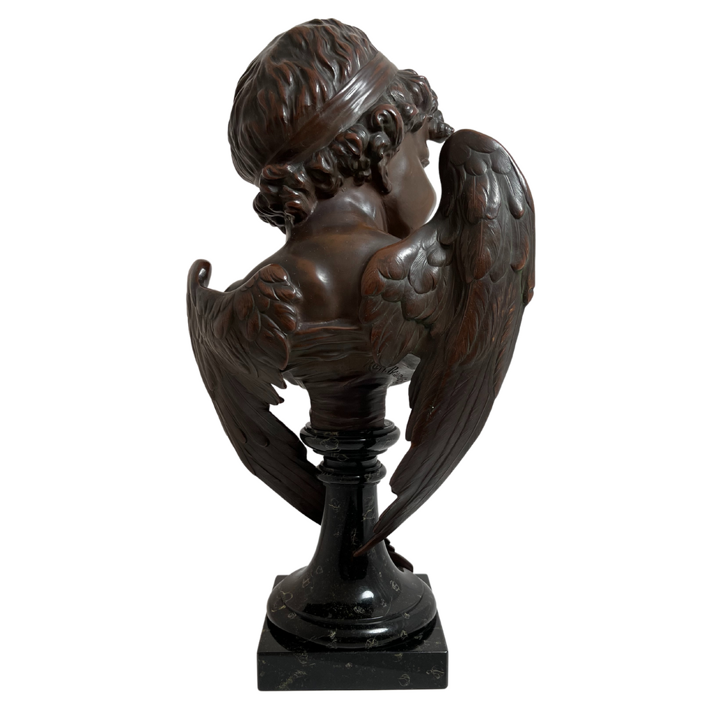 The bronze bust depicts the cherubic figure Amor and is beautifully made with finely cast detail. Bust sits on marble stand.