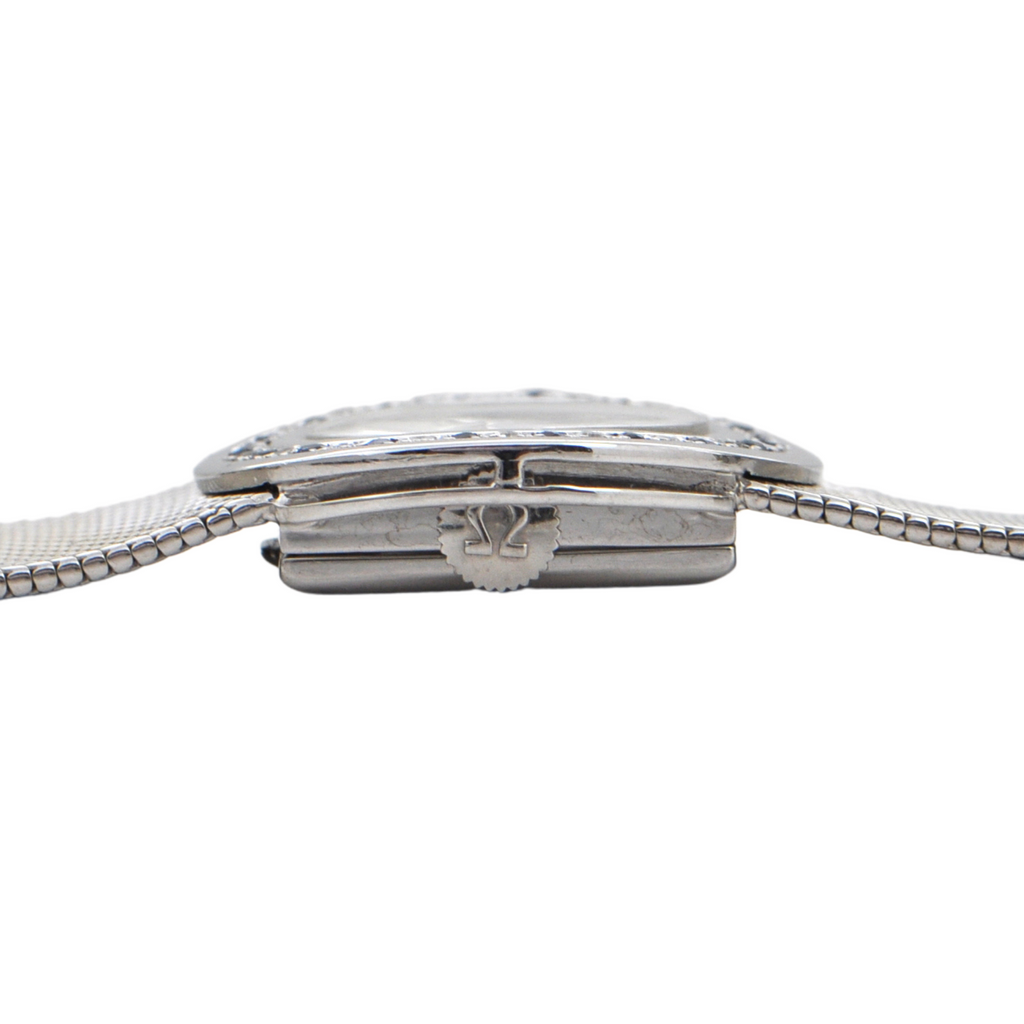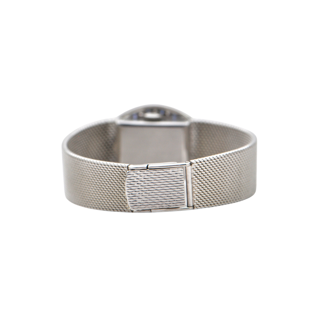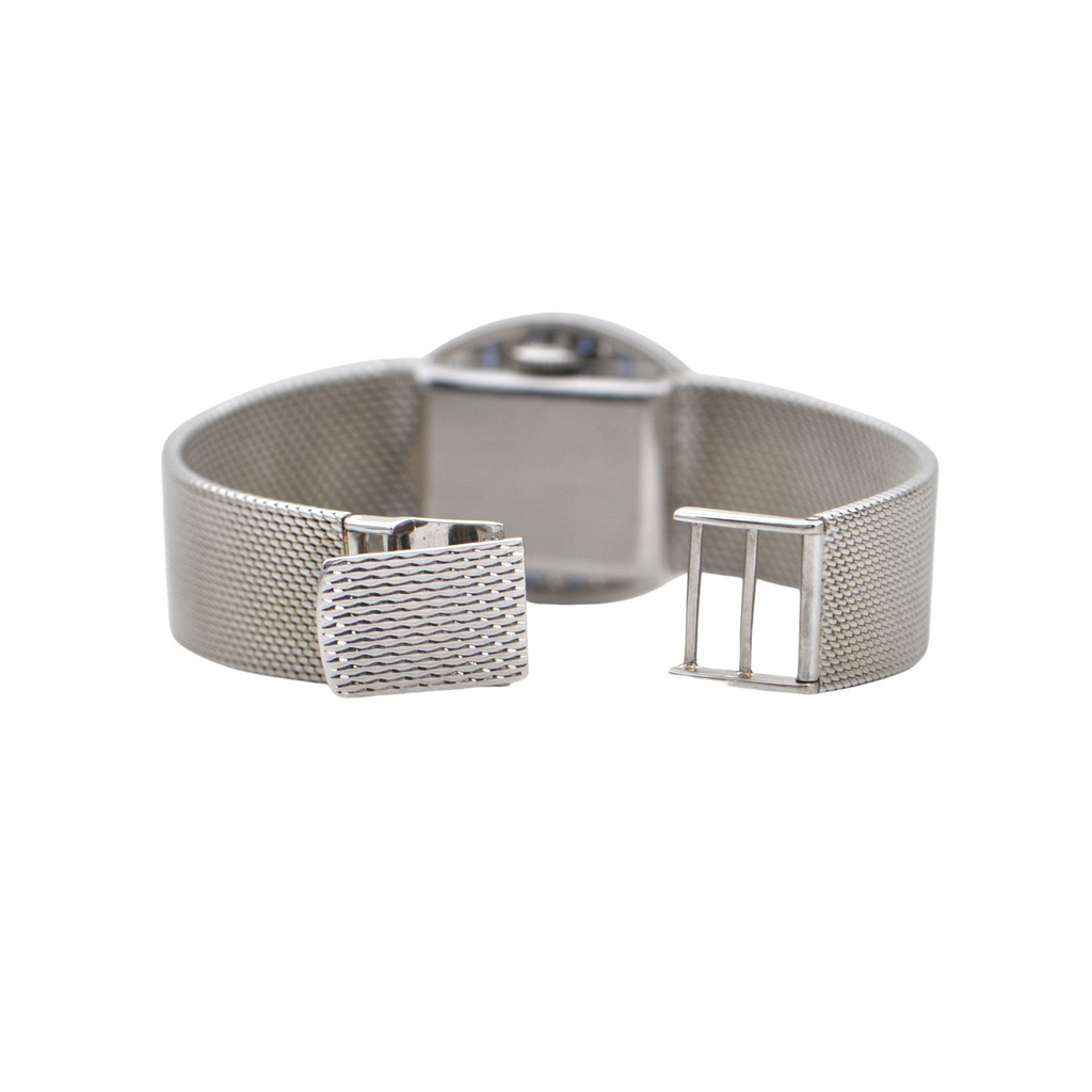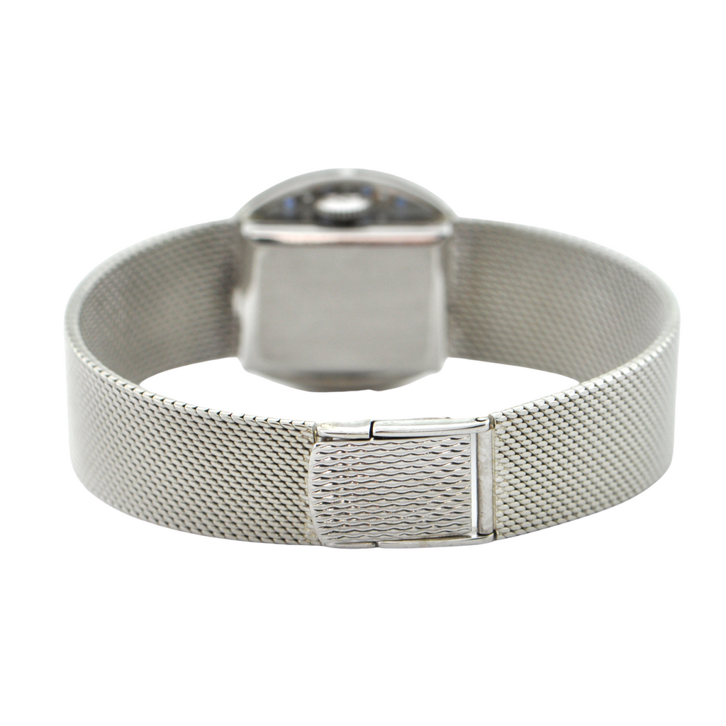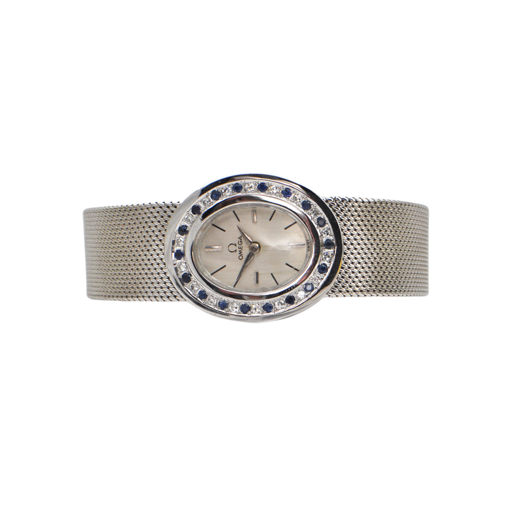 Elegant vintage Omega 18k white gold watch with a bezel accented in diamonds and sapphires c.1960's. Band is tightly woven shark mesh and attaches with a jewelry fold over clasp.