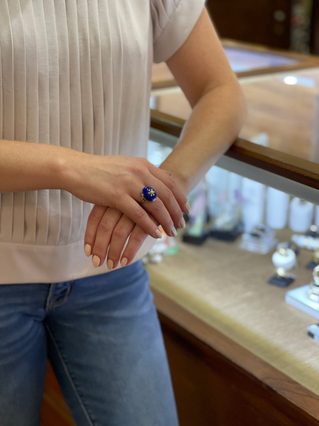 Beautiful antique 0.25ct diamond and pearl 14k gold ring C. 1850. Ring features lovely dark blue guilloche enamel work.