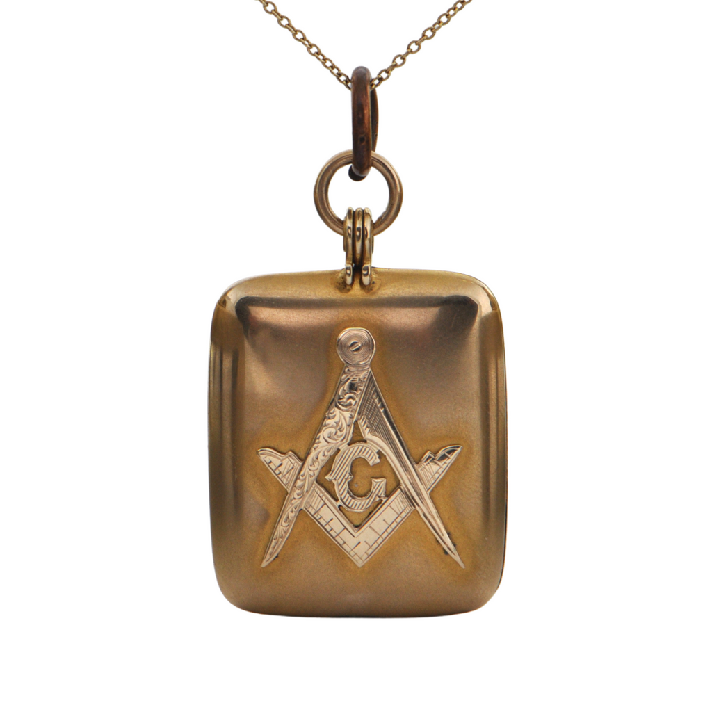 Handsome antique 14k yellow gold Masonic locket. Cover featuring gold square and compass. Back of locket is elegantly hand-engraved with the following inscription: