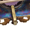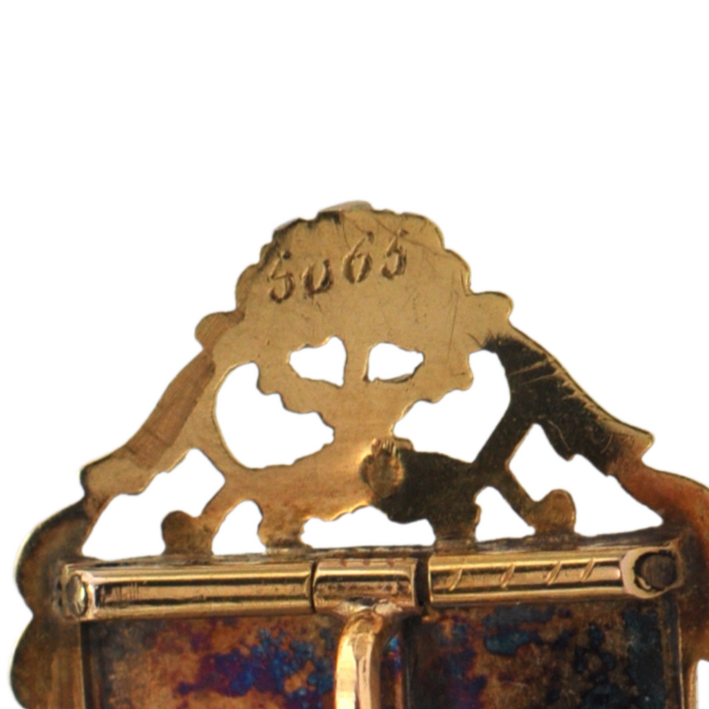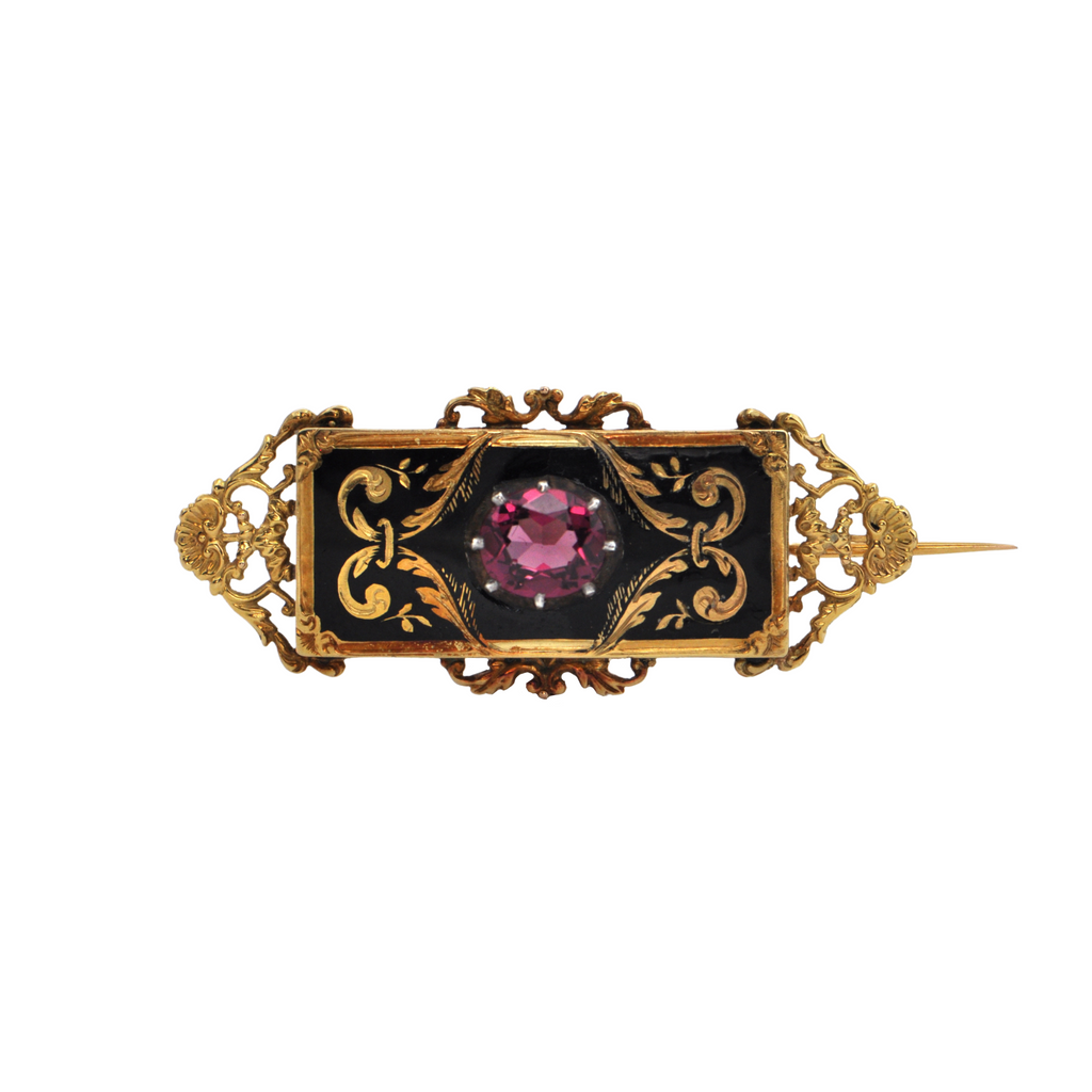 Exceptional 18k yellow gold brooch beautifully decorated with taille d'epargné enameling, the center garnet sparkling in it's silver setting. The pin is framed by expertly detailed acanthus and laurel decorative motif. This pin features a lovely rich original patina only achievable by age.