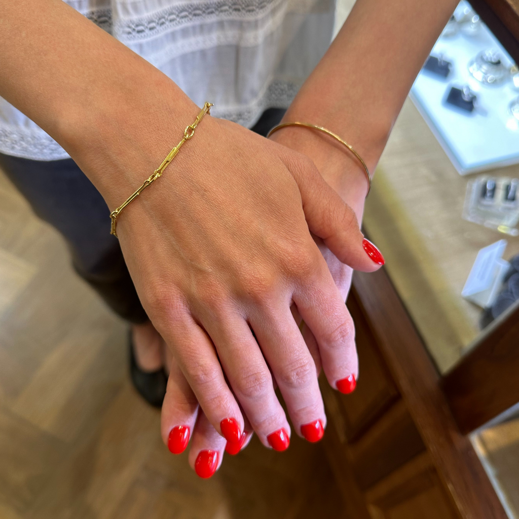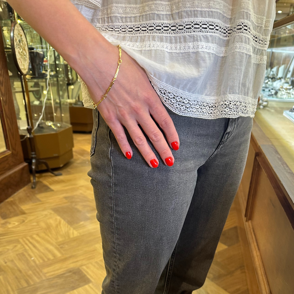 Pocket watches are not as popular as they used to be (unfortunately) so we have converted an antique watch chain into this gorgeous gleaming 18k yellow gold paper clip link bracelet.