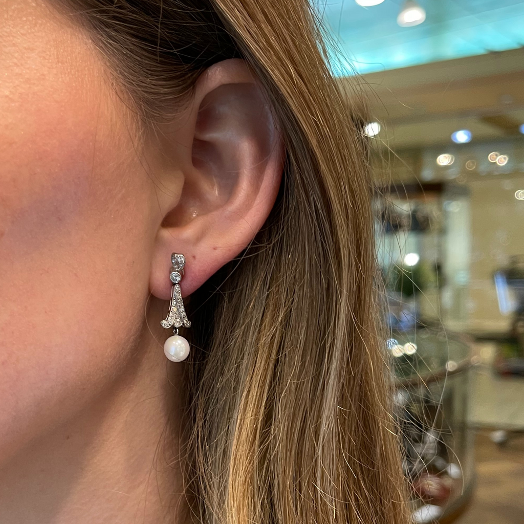 Dating back to flappers, dance halls, and the Charleston hail these Ritzy Art Deco earrings. Created in three parts, and adorned with diamonds, they come together swinging and swaying creating a fantastic display of sparkle. Suspended from the gallery set geometric drop is a single pearl - adding the perfect feminine touch. These beauties are certainly the bee's knees.