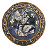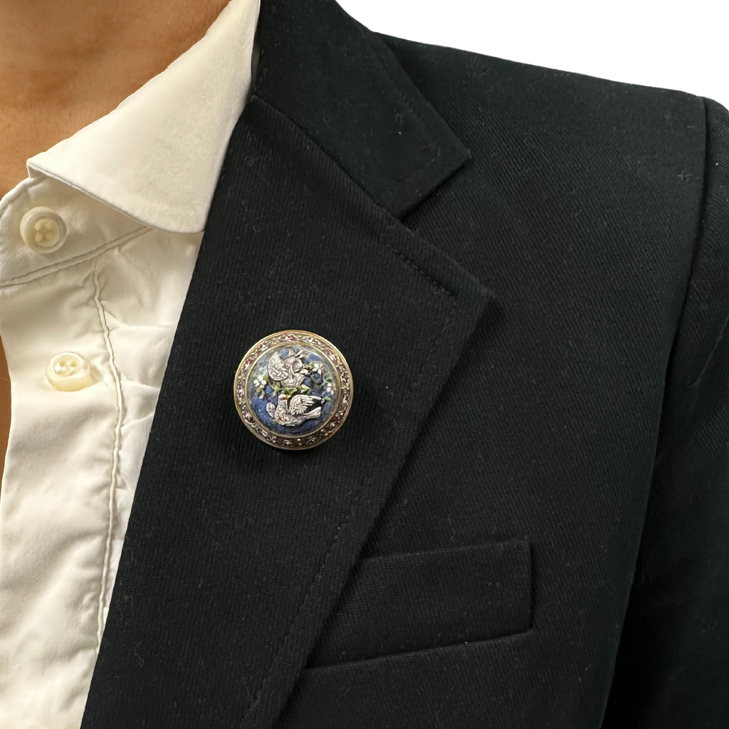 Antique micro-mosaic of two dancing doves amidst a cornflower blue background outlined in red, white, and blue border scalloped in a gold frame.
