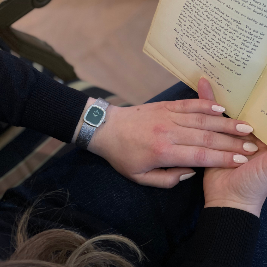 Timeless Baume et Mercier 18k white gold watch with a slightly tapered band featuring a bark finish.