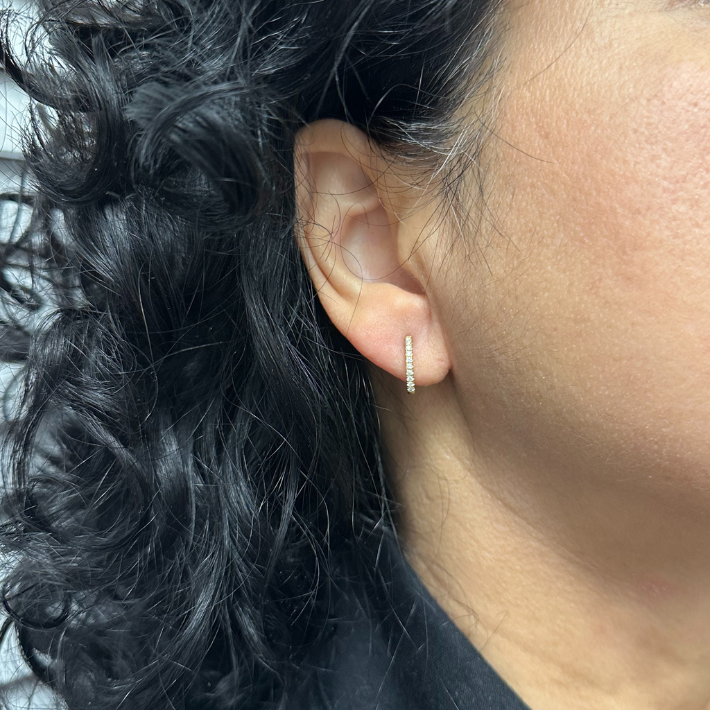 Elegant mini 18k yellow gold and diamond oval huggie hoop earrings. Custom-made by, Monica Savage for Daisy Exclusive. These huggies are perfect alone or with one of our enhancers. These earrings are available in either yellow, white, or rose gold.