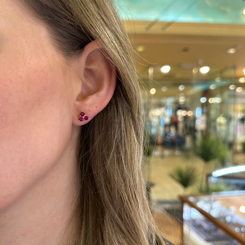 Stunning pair of custom-made Daisy Exclusive ruby 3-stone stud earrings in 18k white gold. Earrings attach with post and butterfly mechanisms, 18k white gold butterflies are included.