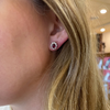 Absolutely stunning pair of rubies radiating from within a halo of near-colorless sparkling diamonds. Stones are set in a platinum raised gallery setting and have 18k white gold posts and butterflies. These chic and stylish ear baubles were custom-made for Daisy Exclusive by, Monica Savage.