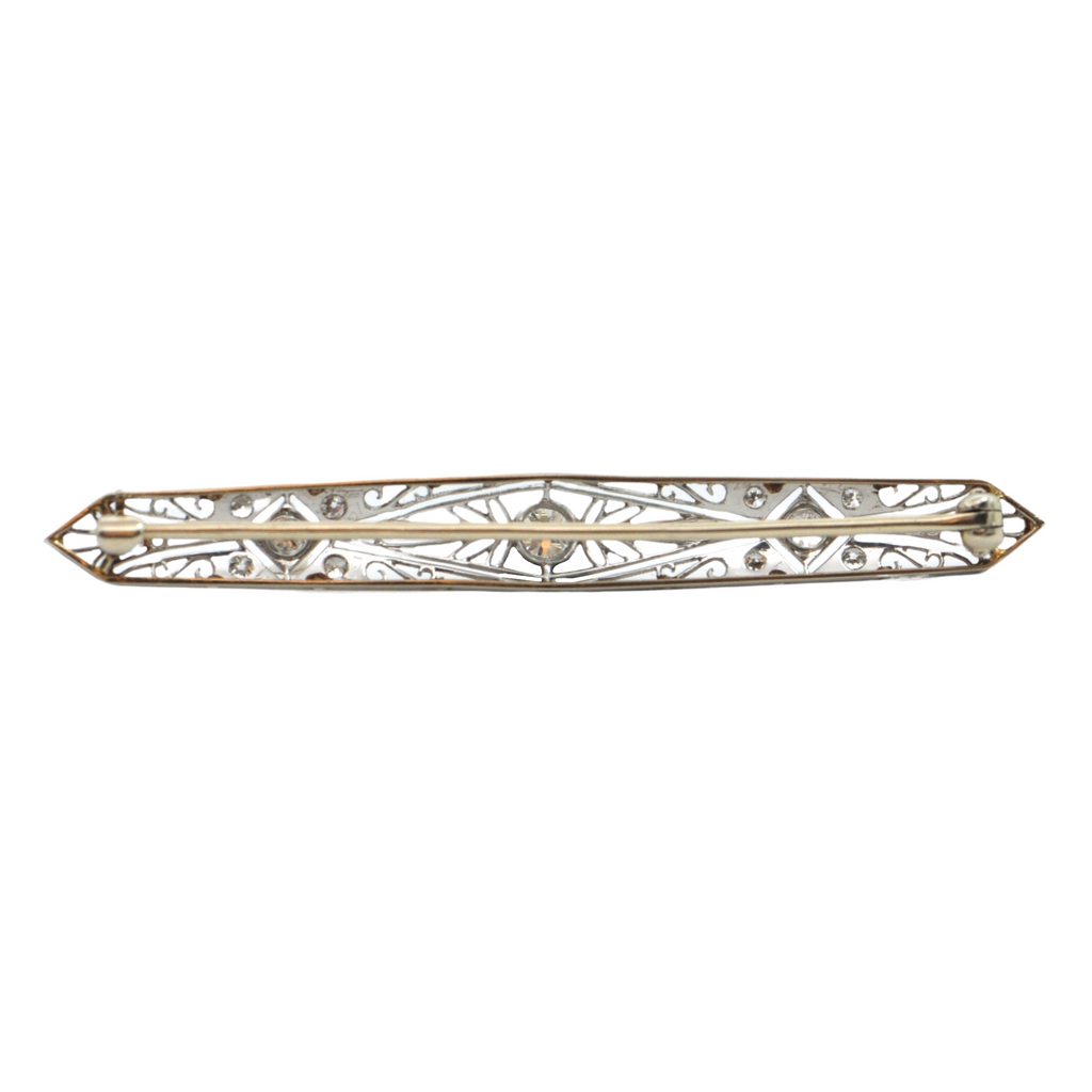 Stunning handmade Edwardian gallery set 0.55CT diamond and 18k white gold bar pin C.1910-1915. This pin is an excellent example of Edwardian craftsmanship displaying openwork and millegrain edging.