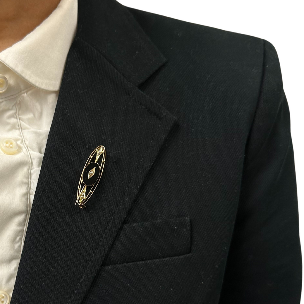 Glossy black onyx is adorned with lustrous seed pearls in this Edwardian 14k yellow gold brooch.