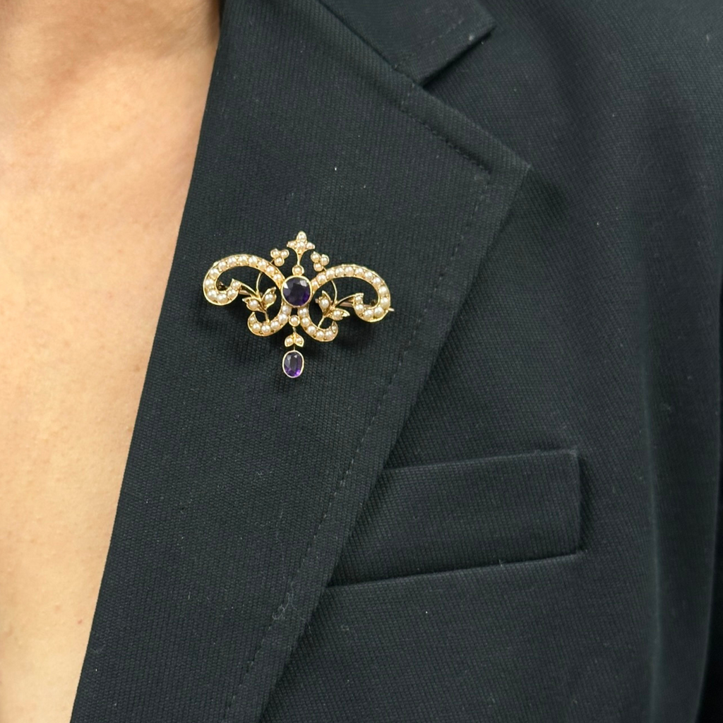 Edwardian English Amethyst and Seed Pearl 15K Gold Brooch